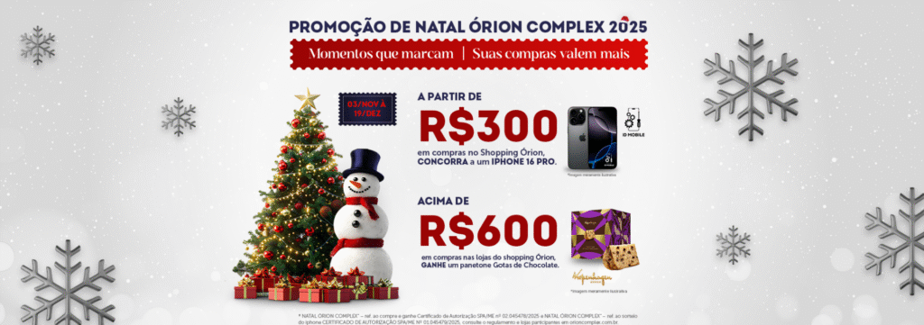 Até o dia 19 de dezembro, a cada R$ 300 em compras os clientes do Órion Shopping ganham um cupom para concorrer a um iPhone 16 Pro. E a cada R$ 600 em compras eles ganham um panetone da Kopenhagen. O sorteio do celular será feito com base na extração da Loteria Federal, realizada pela Caixa Econômica Federal, e o resultado será divulgado no dia 8 de janeiro de 2026.